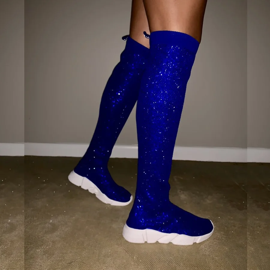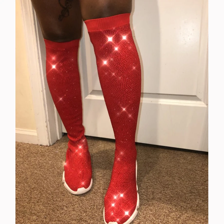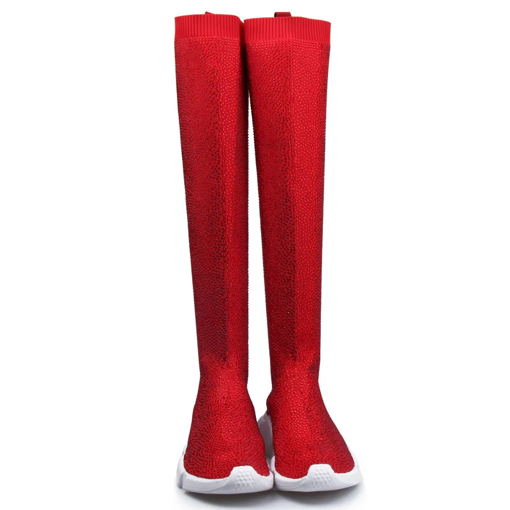 Spring Knee High Sneakers Women Crystal Sock Sneakers Stretchy Knitting Thigh High Boots Handmade R