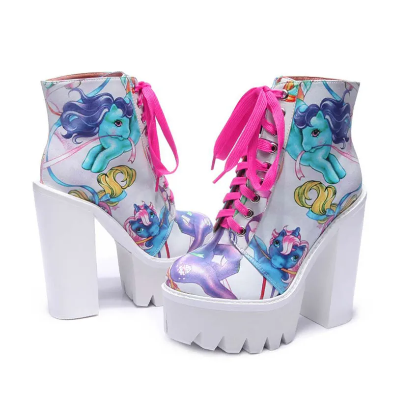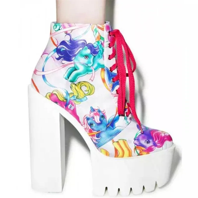 New Winter Women Leather Print Ankle Boots Fall High Platform Chunky Heel Lace Up Women Boots Woman